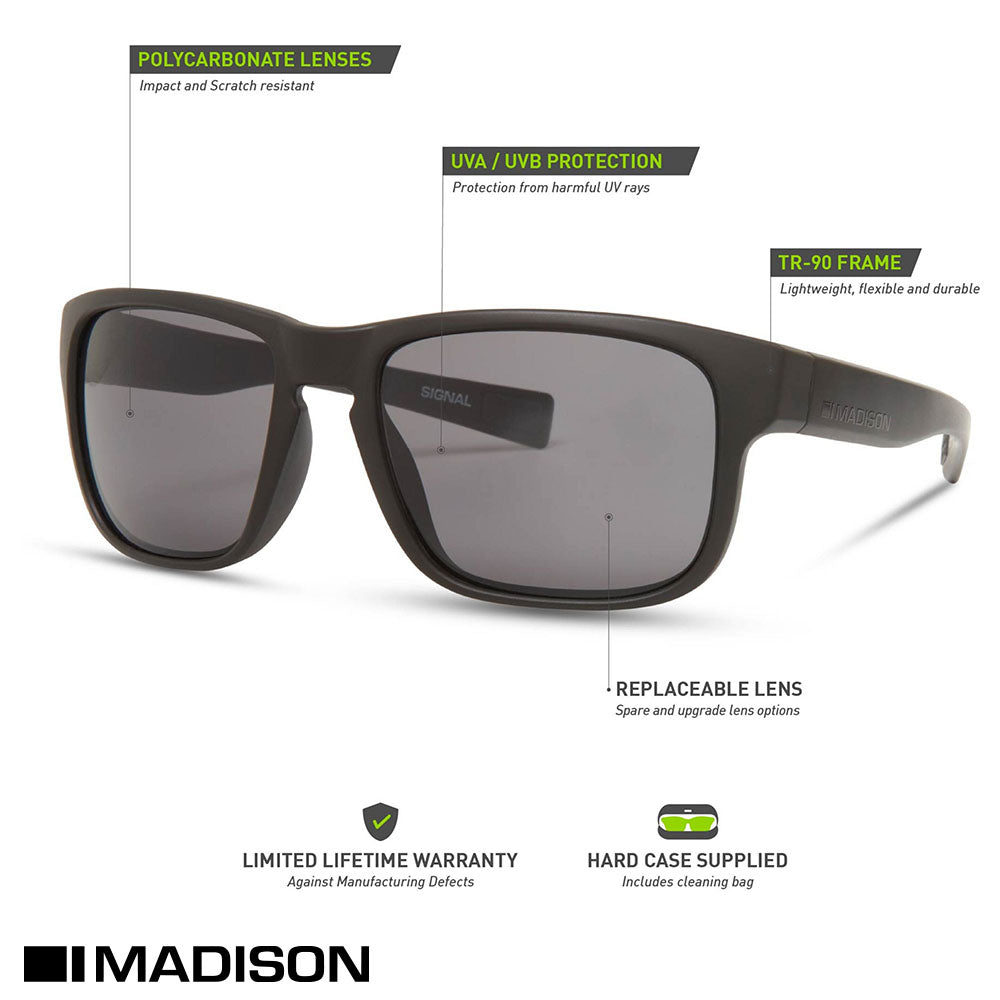 Features: Polycarbonate Lenses: Optics from Madison meets the highest standard for eyewear; ISO 12312. The interchangeable polycarbonate lenses are both impact and scratch-resistant. The lenses offer both supreme optical clarity and UV-A and UV-B protection Polarised Lens: Featuring polarised lenses that are designed to reduce glare and improve visual clarity off surfaces like water, snow, or roads. Benefits include enhanced contrast, more vibrant colour, and reduce eye strain, especially in outdoor activities like fishing and cycling Multi-Purpose: Both versatile and stylish, Signal sunglasses are universally stylish whenever you choose to wear them TR-90 Frames: TR-90 plastics are lightweight, flexible and durable. TR-90 plastic memory allows them to flex and return to their original shape without breaking or bending Secure Fit: Our frames feature non-slip rubber pads for maximum comfort and security. Storage: All our sunglasses come with a zip-up hard case to keep them safe when not on your face and to store spare lenses and the soft cleaning cloth Size Spec: Lens Width: 63mm, Lens Height: 41mm, Frame Width: 140mm, Bridge Height: 10mm, Arm Length: 122mm Limited Lifetime Warranty: At Madison, we pride ourselves on offering an excellent product with aftercare to match. That's why this product is covered by our Limited Lifetime Warranty